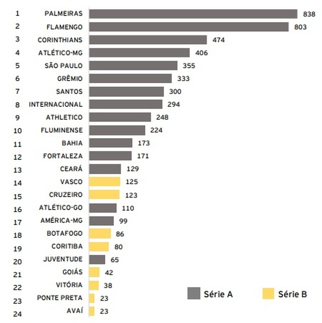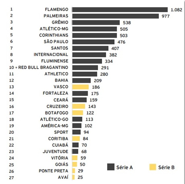 O Vasco teve desempenho melhor no total de receitas do que alguns clubes da Série A, casos de Fortaleza, Ceará, Atlético-GO, América-MG, Sport, Cuiabá e Juventude (1ª imagem).