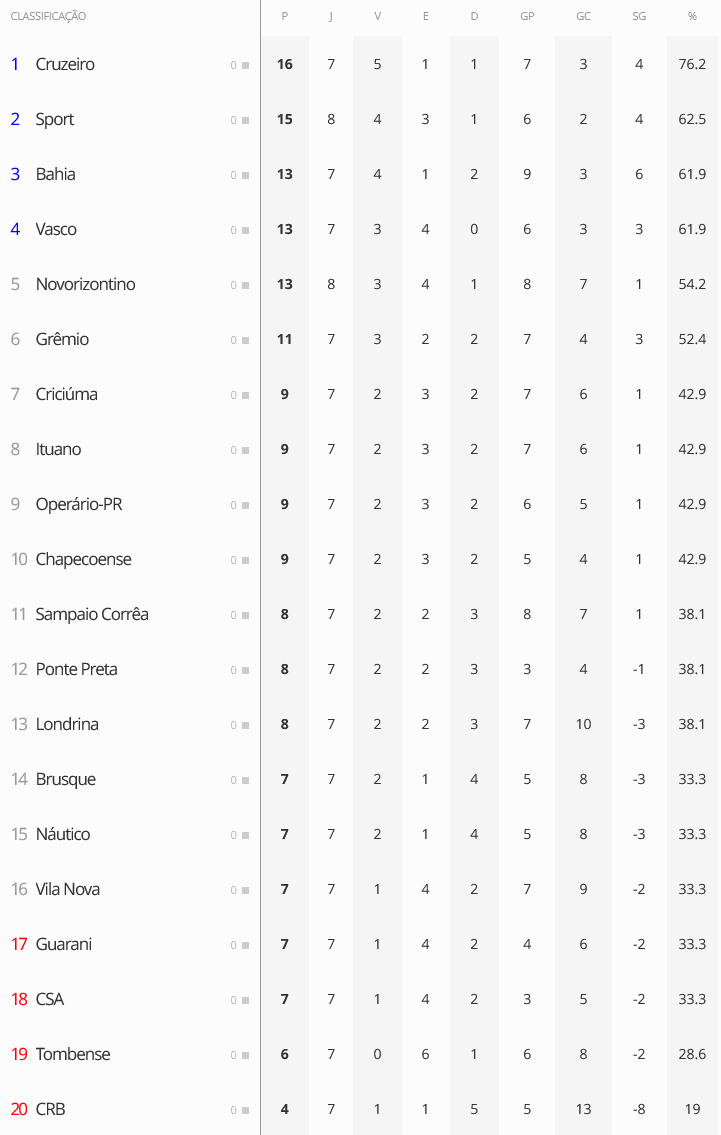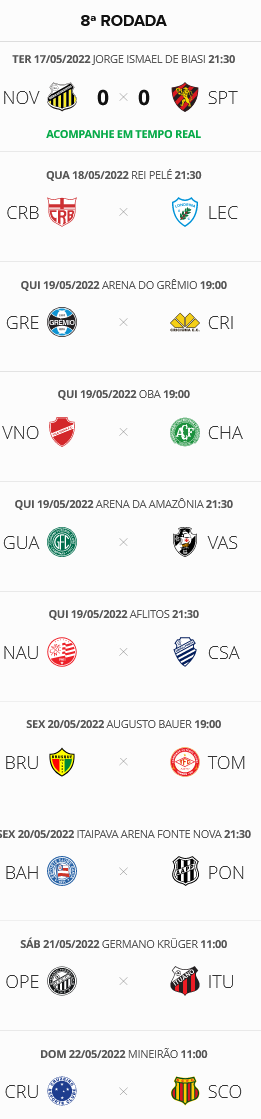 A 8ª rodada do Brasileiro da Série B teve seu início nesta 3ª-feira com o empate sem gols entre Novorizontino e Sport. O resultado impediu que o time paulista tomasse o lugar do Vasco no G4. O Gigante da Colina volta a campo na 5ª-feira, às 21h30 (horário de Brasília), contra o Guarani, na Arena da Amazônia, em Manaus.