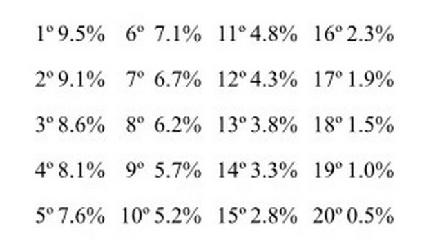 PERFORMANCE - o percentual relativo à performance obedecerá ao seguinte critério de distribuição de acordo com a classificação final na competição: