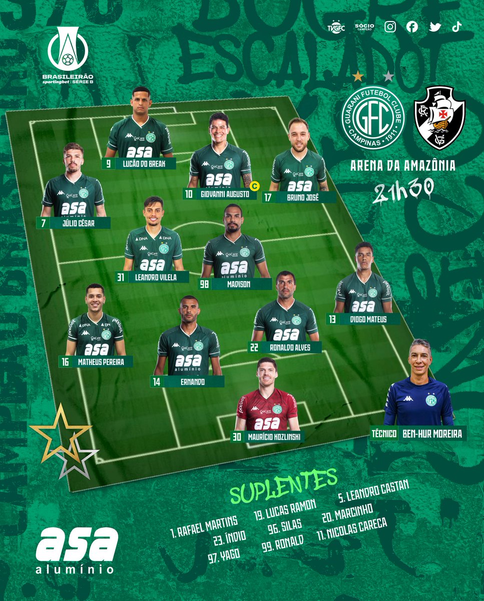 O Guarani está escalado para enfrentar o Vasco, às 21h30, pela oitava rodada da Série B