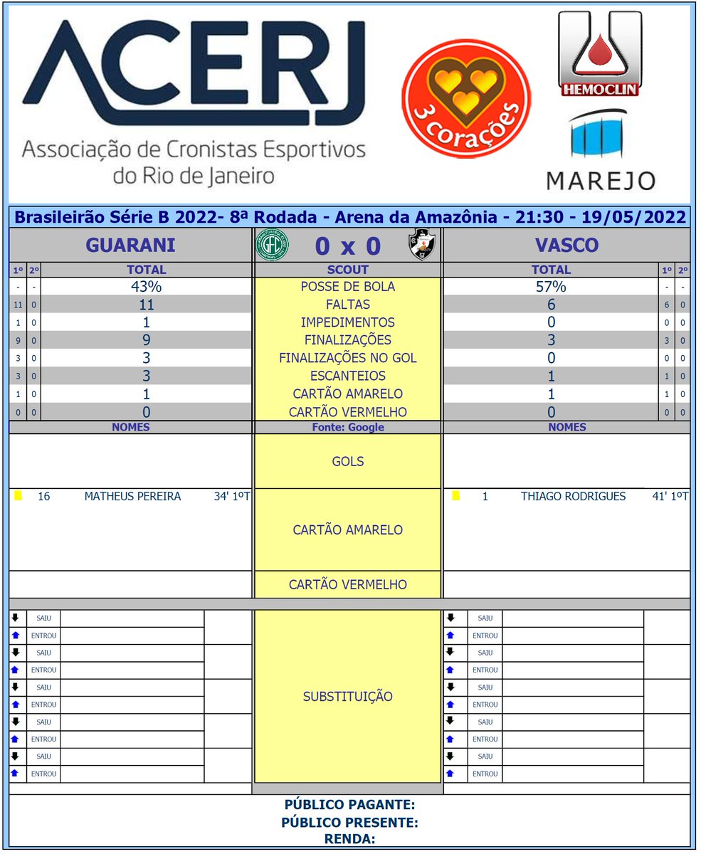 Scout do 1º Tempo de Guarani e Vasco pela 8ª Rodada do Campeonato Brasileiro da Serie B 2022 na Arena da Amazônia (Fonte: Google) #Acerjinforma #BrasileiraoSerieB #GUAxVAS #GuaraniFC #Vasco