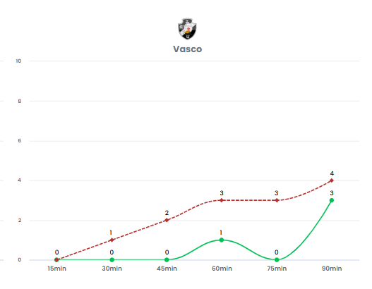 O Vasco na última partida conseguiu criar oportunidade durante boa parte dos 90 min, chamou atenção a constância da equipe, porém, o volume em si não foi tão importante, mas a maneira com que o Vasco finalizava sim. Boa parte das finalizações do Gigante da Colina foram erradas, a primeira finalização certa da equipe foi no minuto 60, após isso, só acertou a meta bugrina no final do jogo.