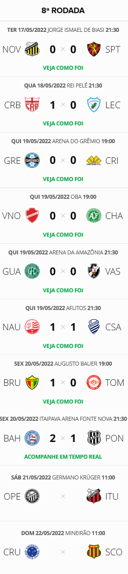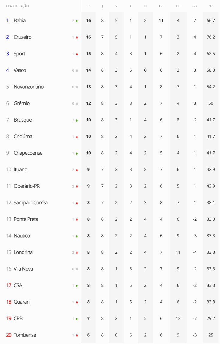 Dois jogos movimentaram a 8ª rodada do Brasileiro da Série B nesta 6ª-feira. O Brusque, próximo adversário do Vasco, venceu o Tombense por 1 a 0 em casa. Já o Bahia derrotou a Ponte Preta por 2 a 1 em casa e chegou provisoriamente à liderança da competição, fazendo o Vasco cair da 3ª para a 4ª colocação, situação que não será modificada pelos 2 jogos que restam para o complemento da rodada.