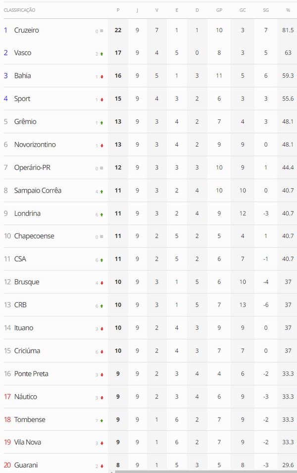 Terminada a 9ª rodada do Campeonato Brasileiro da Série B, o Vasco, que venceu o Brusque por 2 a 0, está na 2ª colocação, a 5 pontos do líder e distante 4 pontos do 5º colocado.