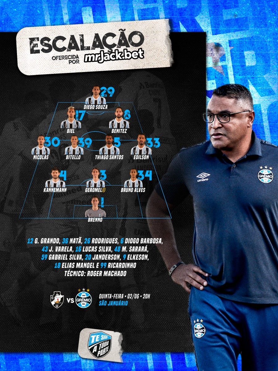 Grêmio também escalado. Diego Souza e Benítez, ex-Vasco, titulares.