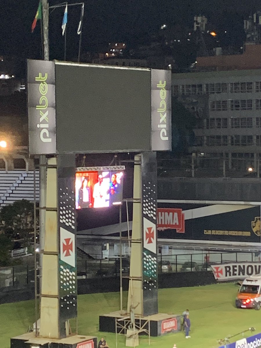 O telão do estádio transmite o pré-jogo da VascoTV. Mais cedo, Roger Machado, técnico do Grêmio, recebeu no estúdio a Medalha Pai Santana pela relevância no combate ao preconceito racial #trcolina