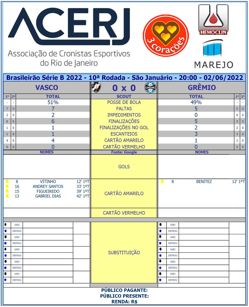 Scout do 1º Tempo de Vasco e Grêmio pela 10ª Rodada do Campeonato Brasileiro da Serie B 2022 em São Januário (Fonte: Google) #Acerjinforma #BrasileiraoSerieB #VASxGRE #Vasco #Grêmio @BrasileiraoB @VascodaGama @Gremio