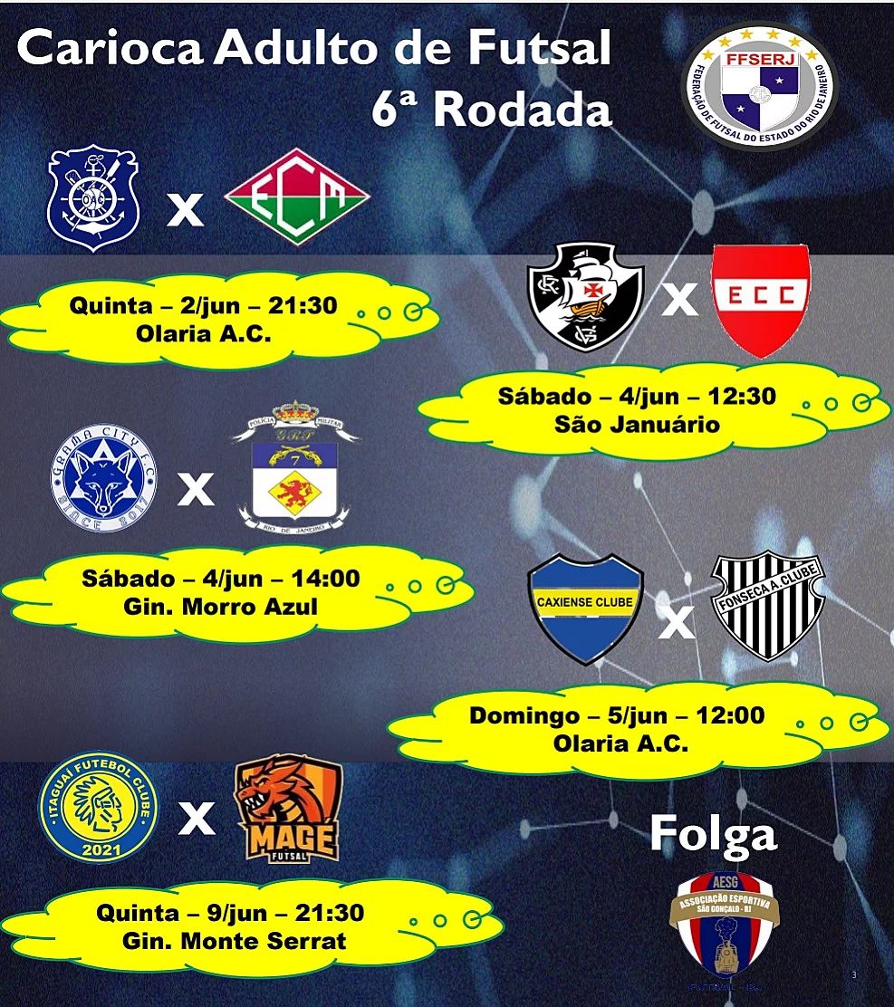 Esta aí a sexta rodada do Carioca Adulto da @ffserjfutsal, que já começa nesta quinta, com o @olariafutsal recebendo o @ecmaricafutsal na famosa Rua Bariri!!