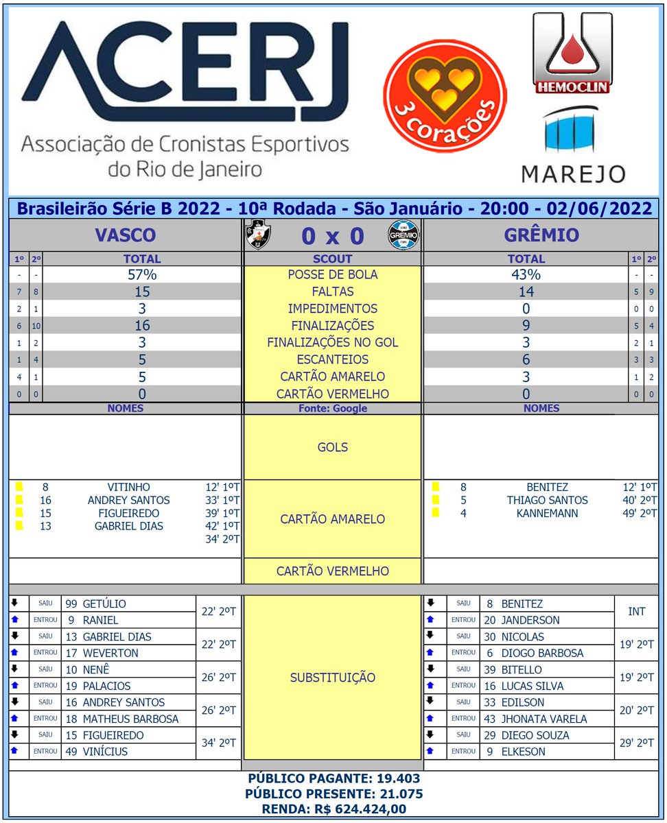 Cartões amarelos: Quintero, Figueiredo, Gabriel Dias, Palacios e Andrey (Vasco); Benítez, Kannemann e Thiago Santos (Grêmio)