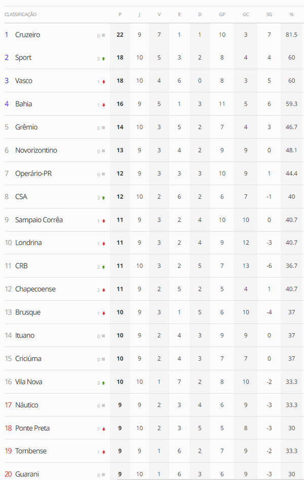 Confira a classificação da Série B após os jogos desta 5ª-feira; Vasco cai para o 3º lugar