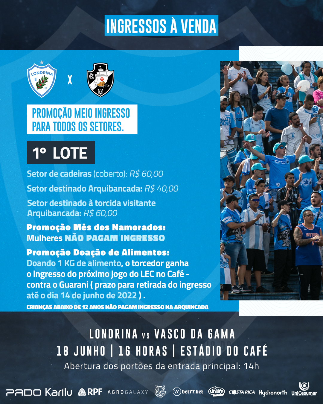 Já estão à venda os ingressos para a partida entre Londrina Esporte Clube e Vasco da Gama, no sábado (18), às 16h, no Estádio do Café. Para o jogo da 13ª rodada da Série B do Campeonato Brasileiro, haverá promoção de meio-ingresso para todos os setores (R$ 40 - arquibancada) e (R$ 60 – cadeira cativa), promoção do "Mês dos Namorados", onde mulheres não pagam ingresso para assistir à partida (qualquer setor do estádio) e promoção através de doação de alimentos - doando 1 KG de alimento, o torcedor ganha o ingresso do próximo jogo do LEC no Estádio do Café - contra o Guarani (prazo para retirada do ingresso até o dia 14 de junho de 2022 nos seguintes estabelecimentos Tubastore, Karilu Fábrica e Vale Sorte). As doações serão destinadas à Creche Novo Amparo.