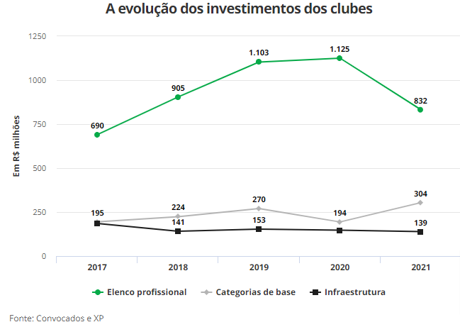 Nesse mesmo período, valores destinados à base aumentaram de R$ 194 milhões para R$ 304 milhões. Esse dinheiro sustenta o desenvolvimento de jovens jogadores: refeições, materiais esportivos, treinamento etc.