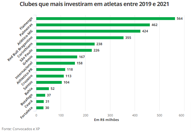 O Red Bull Bragantino também se destaca. Comprado pela fabricante de energéticos em 2019, o clube investiu R$ 355 milhões em contratações. Corinthians, São Paulo e Grêmio aparecem na sequência, porém com relativa distância para os maiores investidores.