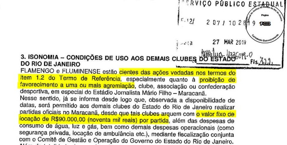 São três os documentos que estipulam as regras para uso do Maracanã por Fla e Flu. Um é o Termo de Permissão de Uso. Outro, o Termo de Referência. Neste, os clubes se comprometem a não praticar regras diferentes para as agremiações que queiram alugar o estádio. O terceiro, é a proposta enviada por Flamengo e Fluminense para usar o estádio. Neste documento, a dupla se comprometeu a cobrar o valor de R$ 90 mil para quem quisesse alugar o Maracanã, como mostra o trecho abaixo.