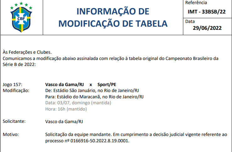 Agora confirmado pela CBF, com alteração na tabela: jogo de domingo, contra o Sport, no Maracanã. #VascoENM