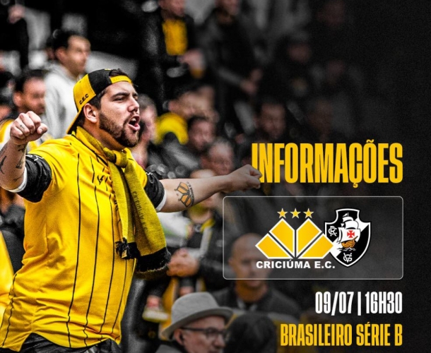 O Criciúma recebe o Vasco no dia 9 de julho pela 17ª rodada do Campeonato Brasileiro da Série B. A partida será disputada às 16h30min no estádio Heriberto Hülse. Para o confronto, devido a quantidade de sócios ativos do clube e também a limitação da capacidade de público no estádio, fica definido que: