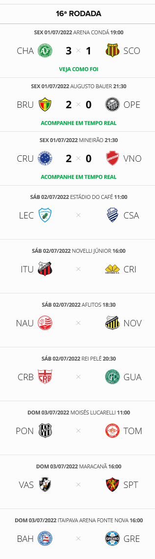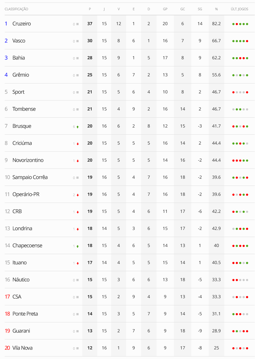 Três jogos abriram a 16ª rodada do Brasileiro da Série B nesta 6ª-feira. O Cruzeiro venceu o Vila Nova por 2 a 0 e abriu 7 pontos em relação ao Vasco, que segue em 2º lugar e a 9 pontos do 5º colocado. O Gigante da Colina enfrenta o Sport neste domingo, às 16h, no Maracanã.