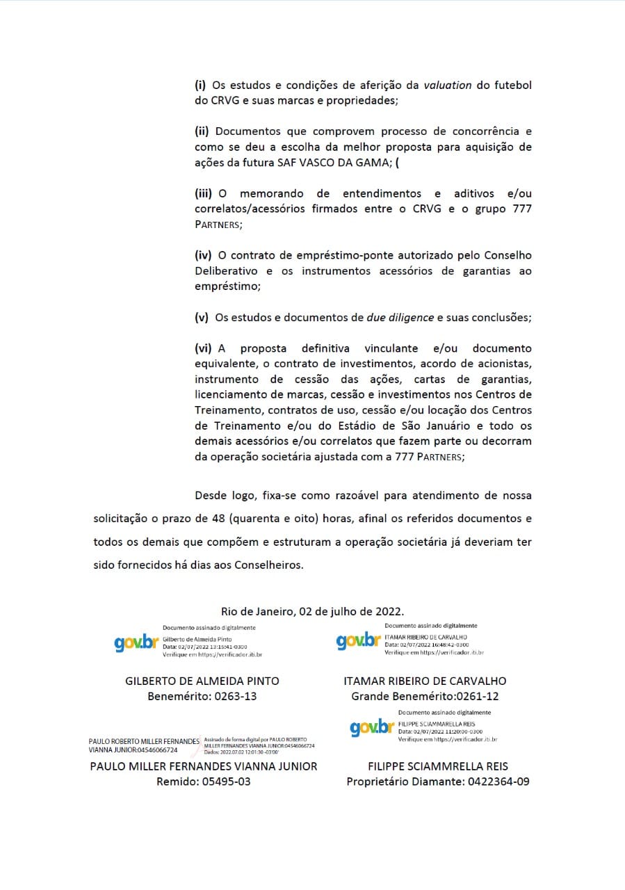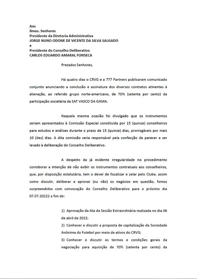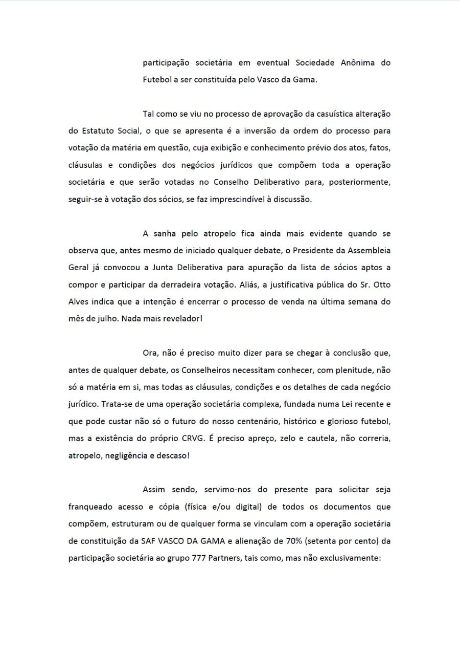 Conselheiros protocolam solicitação de acesso à íntegra da documentação do acordo com a 777 Partners