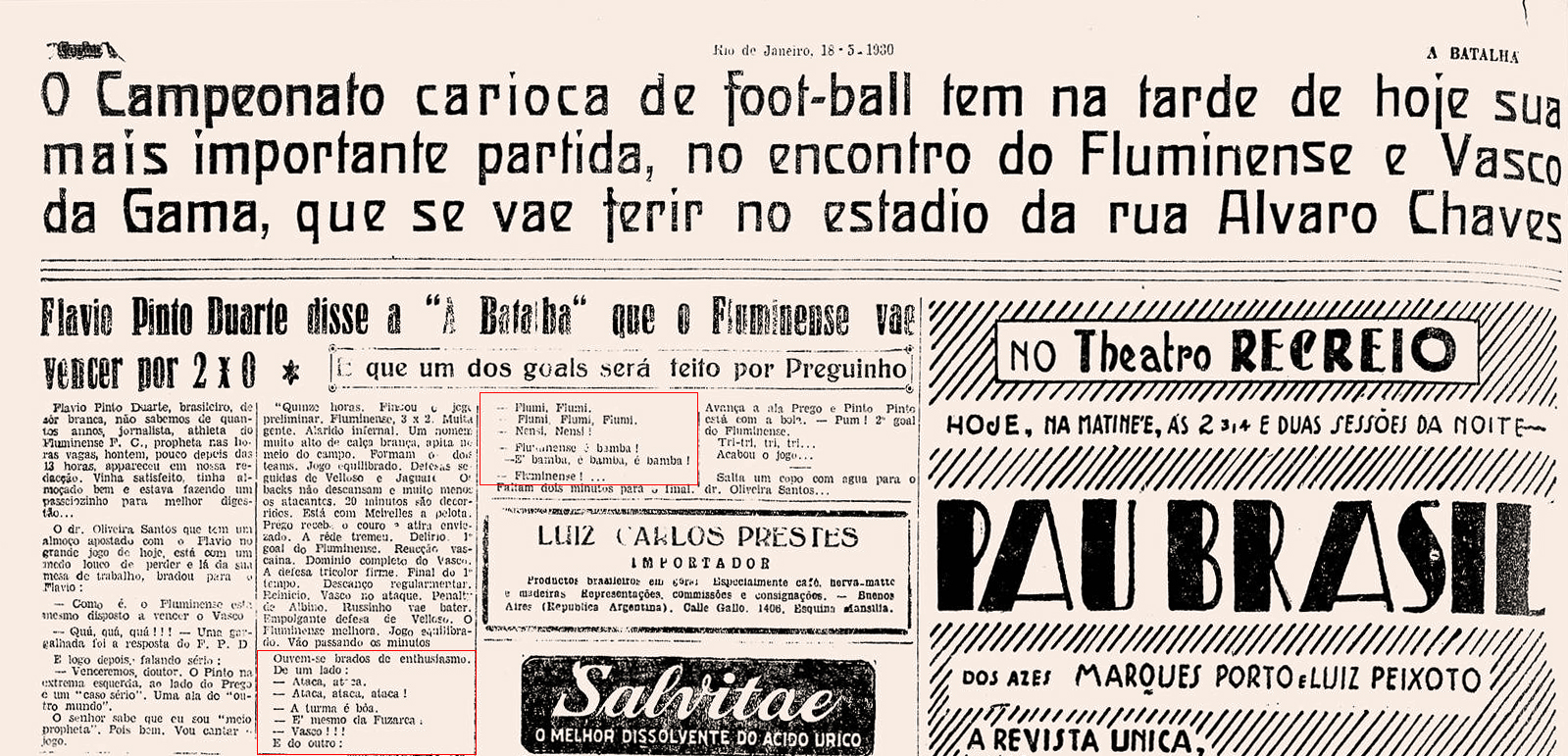 O registro deste fato foi feito pelo jornal "A Batalha" sobre um prognóstico furado de um atleta tricolor para o jogo de 18/05/1930 contra o Fluminense que resultou num empate de 1 a 1, no 1.º turno do Campeonato Metropolitano.