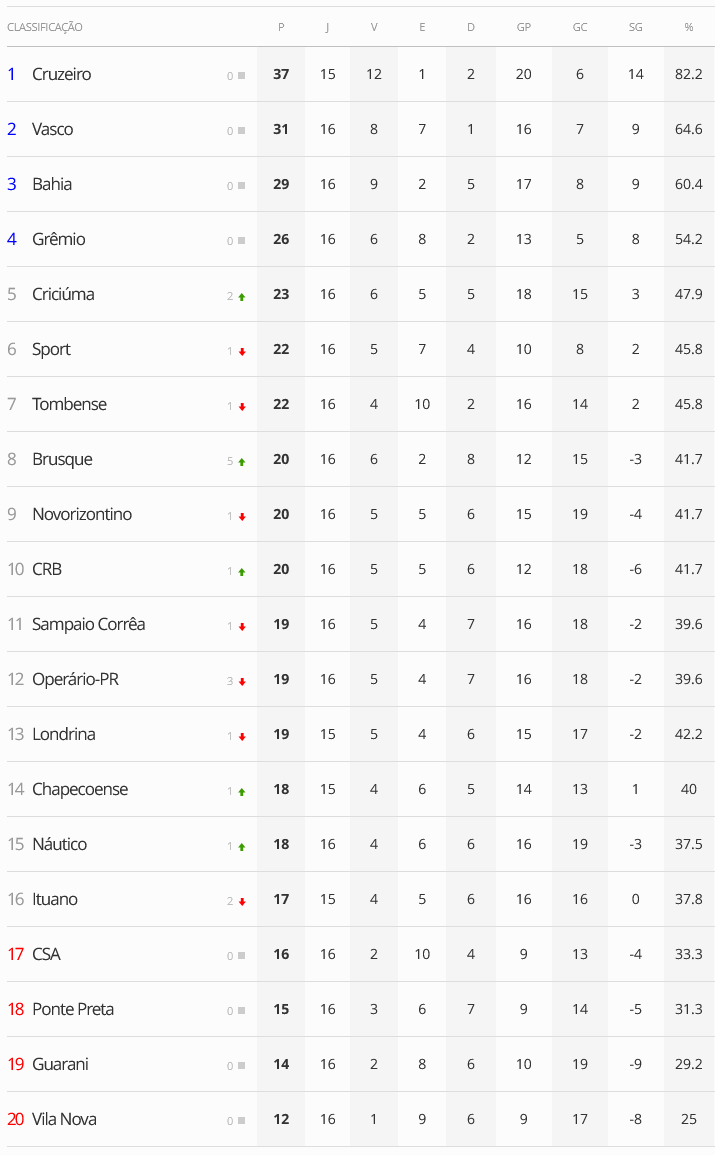 Terminada a 16ª rodada do Campeonato Brasileiro da Série B, o Vasco, que empatou com o Sport por 0 a 0, se manteve na 2ª posição. O Gigante da Colina está 6 pontos atrás do líder Cruzeiro (que tem um jogo a menos) e 8 pontos à frente do 5º colocado, o Criciúma, que é o 1º time fora do G4.