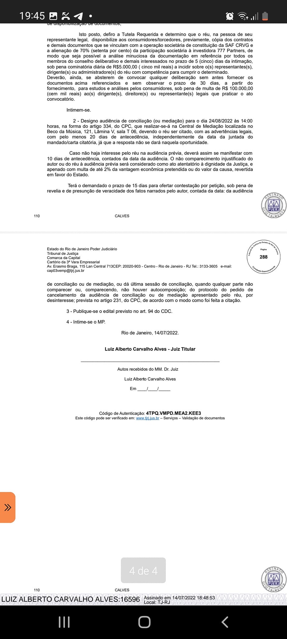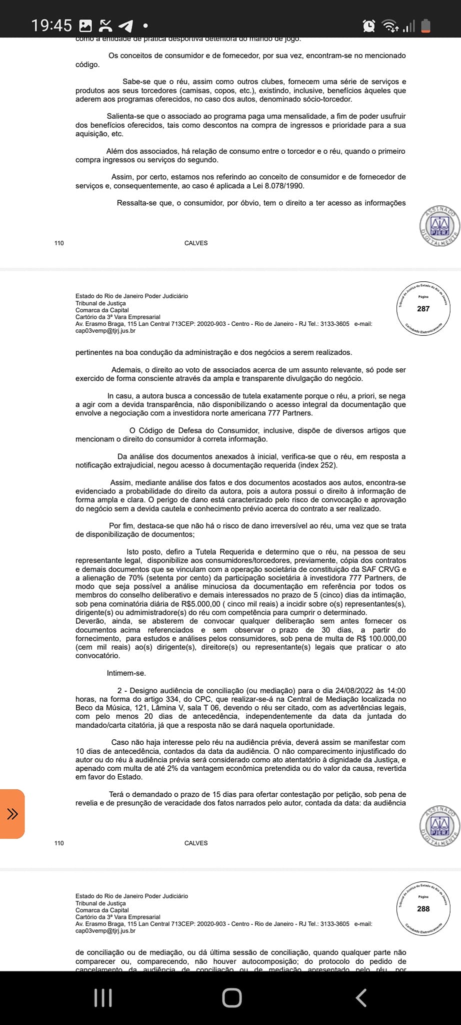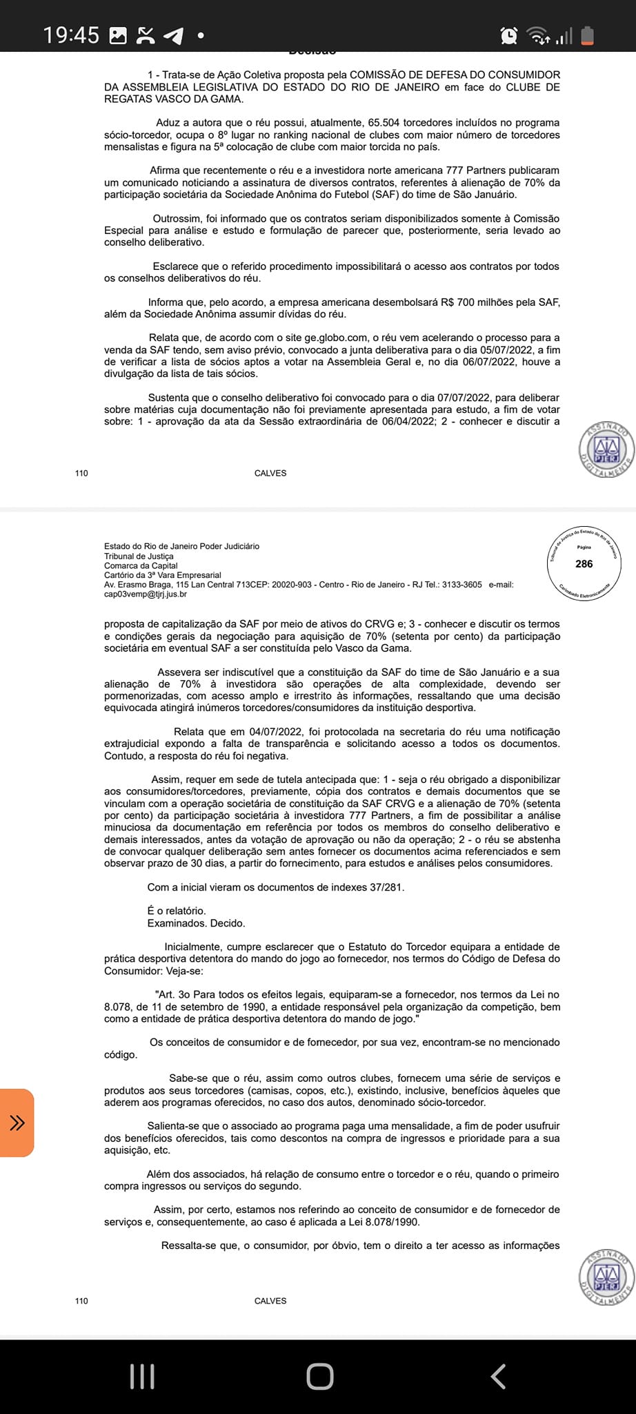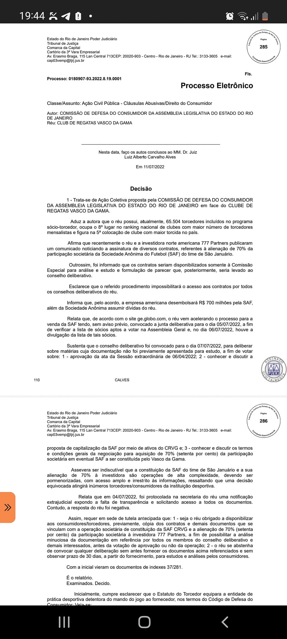 Veja a íntegra da decisão judicial que determina que o Vasco apresente os contratos com a 777 Partners