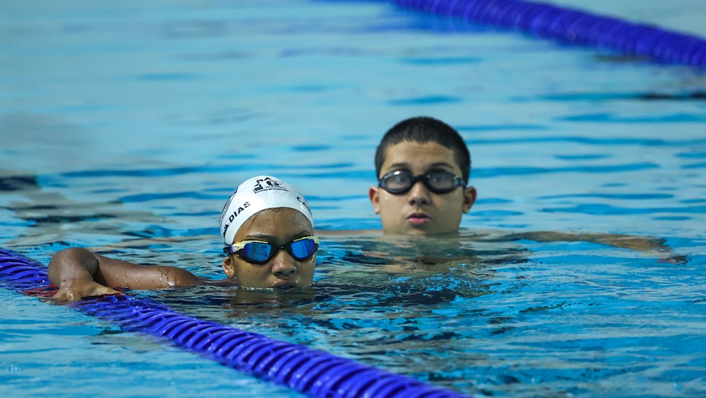 A carioca Camila Emanuelly, 12, e o paulista Murilo Akyra, 17 participam pela primeira vez da semana de treinos das Seleções Brasileiras sub-18 e sub-20 de natação, que acontece no Centro de Treinamento Paralímpico, em São Paulo.