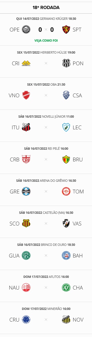 Um jogo abriu a 18ª rodada do Brasileiro da Série B nesta 3ª-feira. O Sport, 5º colocado, empatou com o Operário fora de casa por 0 a 0, manteve-se na mesma colocação e ficou a 8 pontos do Vasco, que segue em 2º lugar. O Gigante da Colina vai a campo no sábado, às 16h30, contra o Sampaio Corrêa em São Luís.