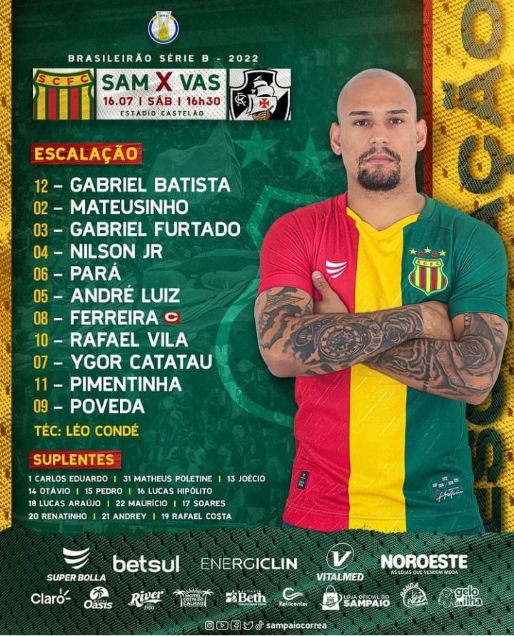 Sampaio Corrêa escalado. Destaque para Ygor Catatau, ex-Vasco, e o craque Pimentinha.
