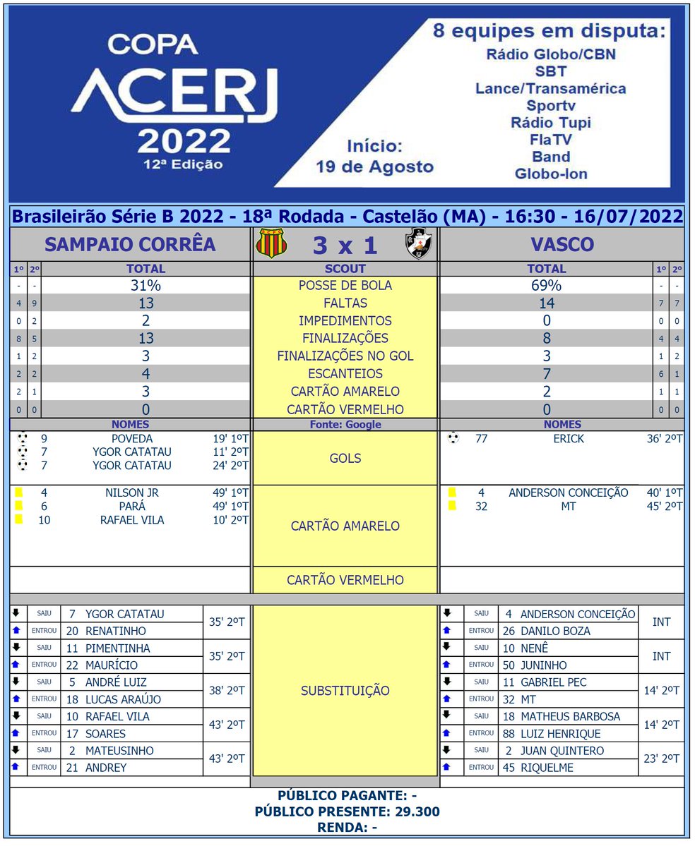 Scout Final de Sampaio Corrêa e Vasco pela 18ª Rodada do Campeonato Brasileiro da Serie B 2022 no Castelão (MA) (Fonte: Google) #Acerjinforma #BrasileiraoSerieB #SAMxVAS #SampaioCorrea #Vasco @BrasileiraoB @sampaiocorrea @VascodaGama