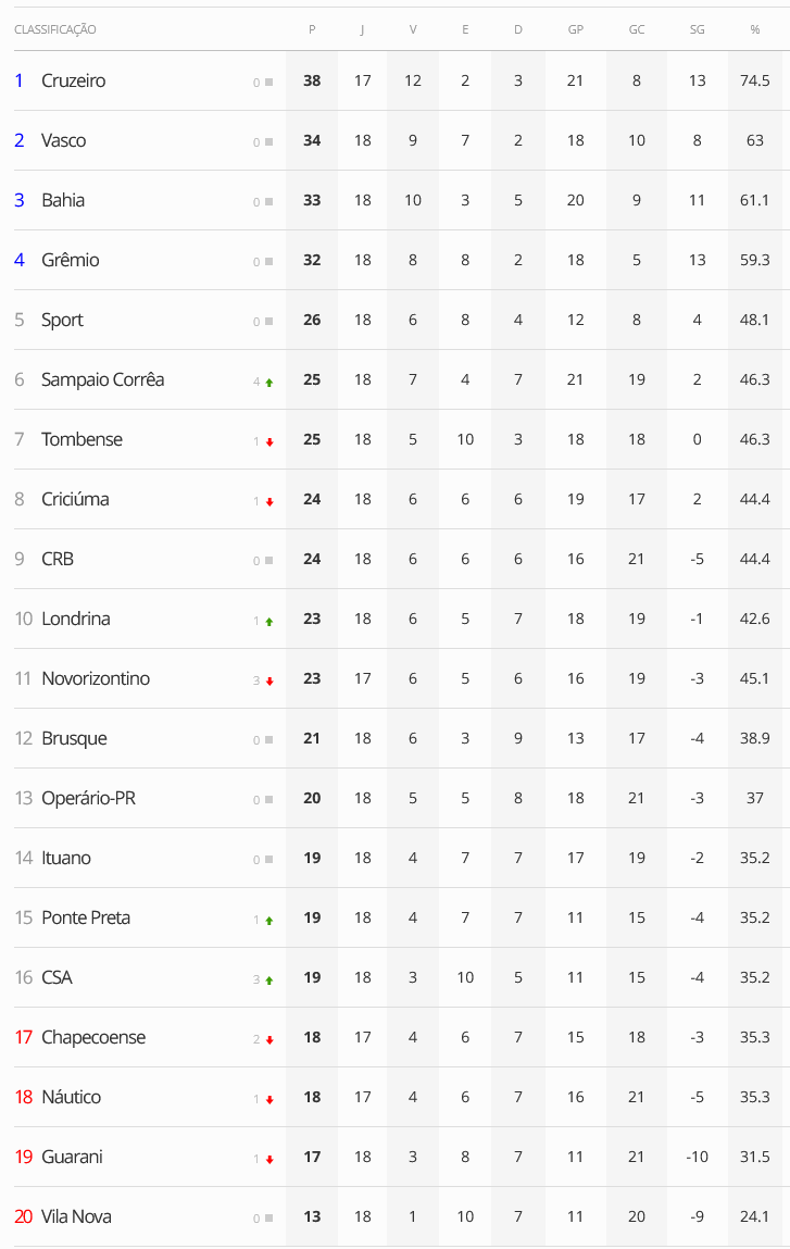 Mesmo com a derrota por 3 a 1 para o Sampaio Corrêa, o Vasco terminará a 18ª rodada da Série B do Brasileiro a 8 pontos do 5º colocado. Já dentro do G4, a situação se complicou: Grêmio e Bahia venceram e se aproximaram do Gigante da Colina, que segue em 2º lugar, e o líder Cruzeiro, que ainda joga na rodada, pode se distanciar.
