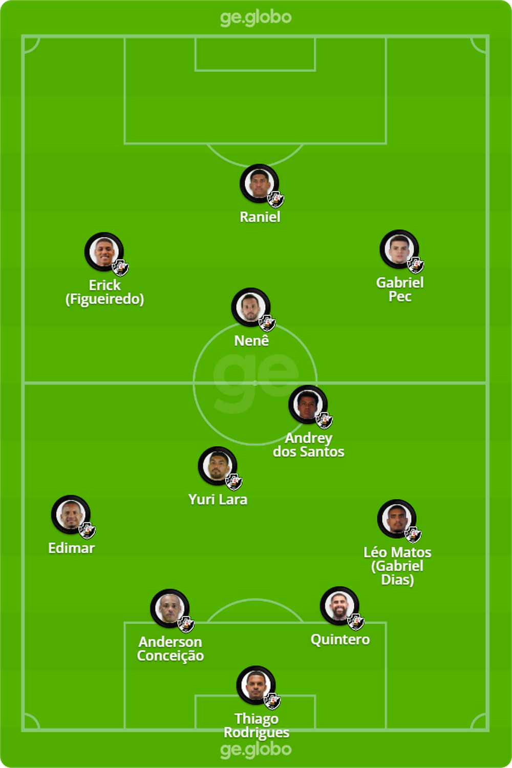 Provável escalação do Vasco: Thiago Rodrigues, Léo Matos (Gabriel Dias), Quintero, Anderson Conceição, Edimar, Yuri Lara, Andrey Santos, Nenê, Gabriel Pec, Erick (Figueiredo) e Raniel.
