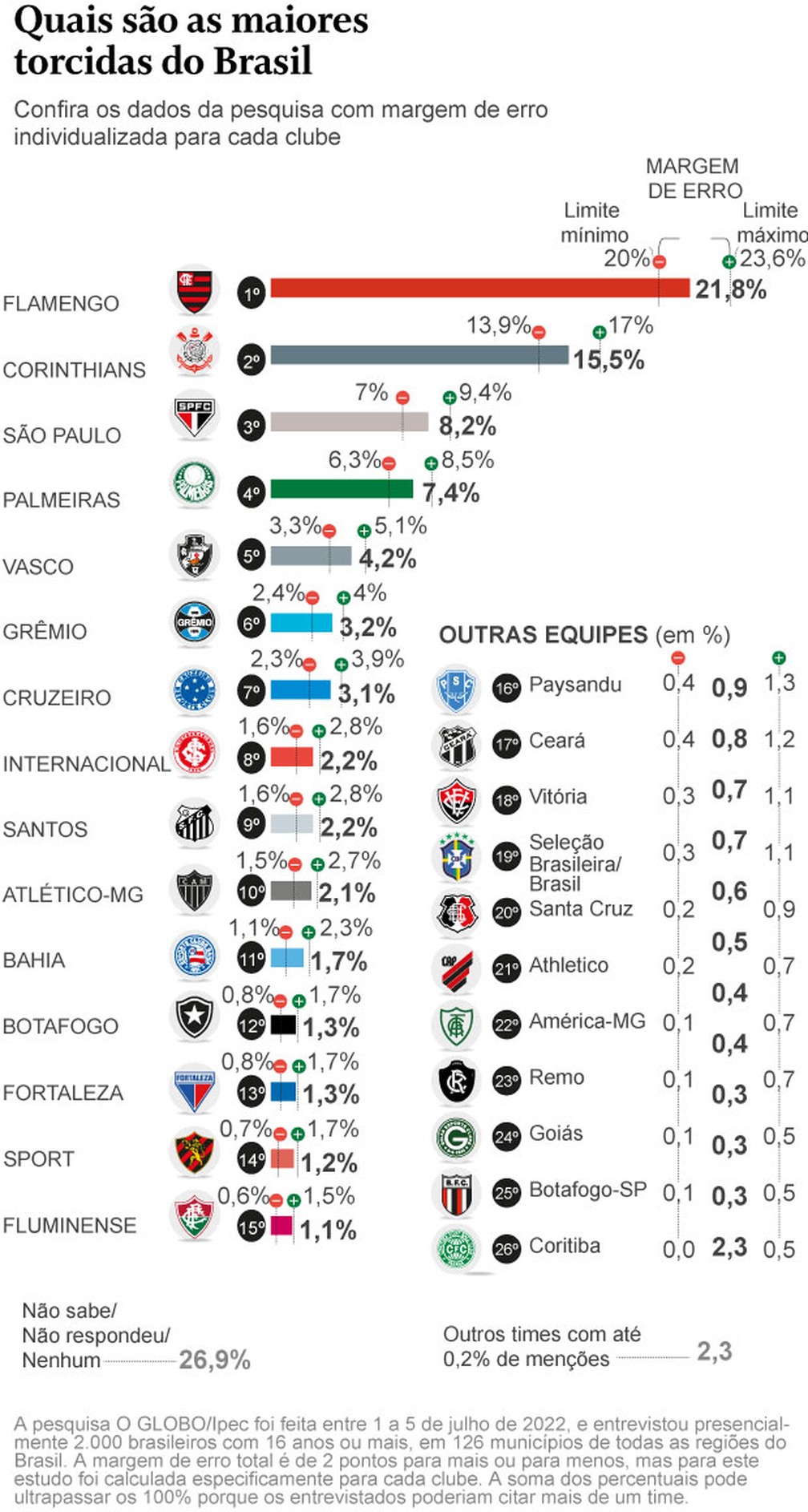 A pesquisa O GLOBO/Ipec calculou margens de erro individualizadas por cada clube, levando em consideração o resultado de cada um deles. Time de maior torcida do Brasil, o Flamengo, por exemplo, marcou 21,8%, mas, considerando esse critério estatístico, pode ter entre 20% e 23,6%.
