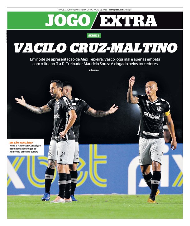 Pelo Brasileiro da Série B, o Vasco empatou por 1 a 1 com o Ituano em São Januário, em jogo antecedido pela apresentação de Alex Teixeira. Veja as capas dos jornais.