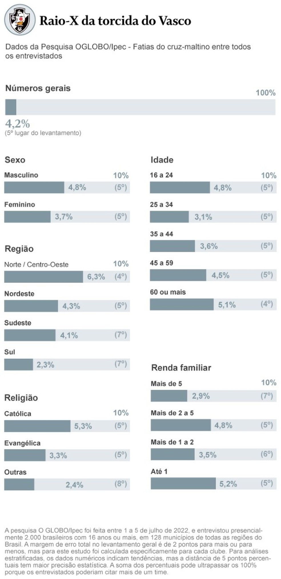 No geral, o Vasco soma 4,2% da preferência dos torcedores brasileiros. Esse número é mais alto entre os mais velhos, de 60 anos ou mais (5,1%). Posteriormente, com a redução da idade dos entrevistados na pesquisa, esse número diminui gradativamente. Sai de 4,5% (45 a 59 anos), passa a ser 3,6% (35 a 44 anos) e chega a 3,1%, quando o entrevistado possui entre 25 e 34 anos. O número colocaria o cruz-maltino como a sétima maior torcida, em termos gerais. Veja os principais dados no infográfico abaixo.