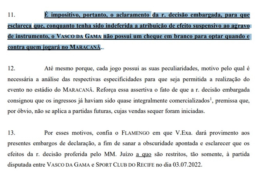 O Flamengo entrou na Justiça com uma petição para tentar garantir que o Vasco não consiga jogar no Maracanã por sua própria vontade exclusivamente. A equipe cruz-maltina teve a autorização de mandar seu duelo com o Sport no estádio, e o requerimento é que fique claro que esta decisão foi específica para este confronto.