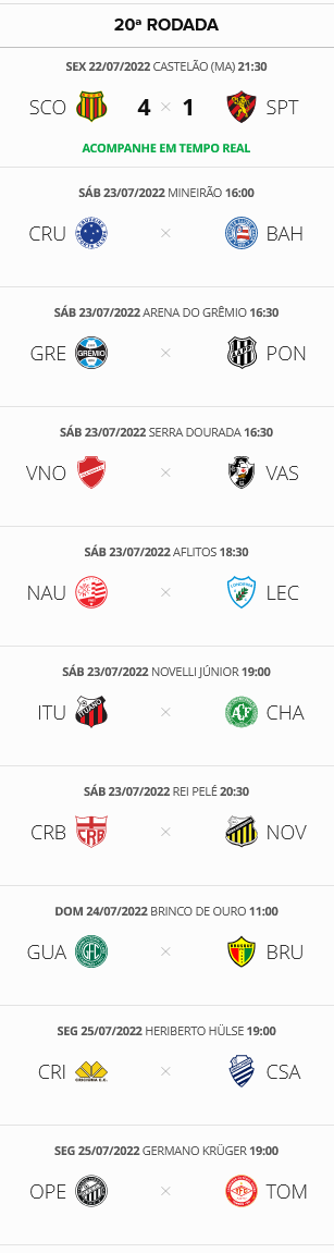 O 2º turno do Brasileiro da Série B começou nesta 6ª-feira com um jogo: Sampaio Corrêa 4 x 1 Sport. Com o resultado, o time maranhense chegou à 5ª posição e ficou a 7 pontos do Vasco. O Gigante da Colina, 2º colocado, vai a campo neste sábado, às 16h30, contra o Vila Nova, em Goiânia.
