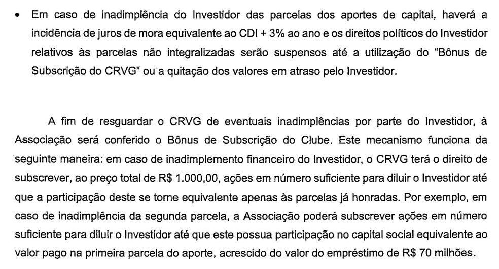 - Compromisso de investimento mínimo no futebol até 2026, com valores pré-determinados para 2022 e 2023; a partir de 2024, investimento mínimo corresponde ao maior valor entre "determinado percentual das receitas líquidas anuais da 777 no ano anterior ou um valor fixo, que é consideravelmente maior do que o maior orçamento do futebol que o CRVG já teve em qualquer ano de sua história".