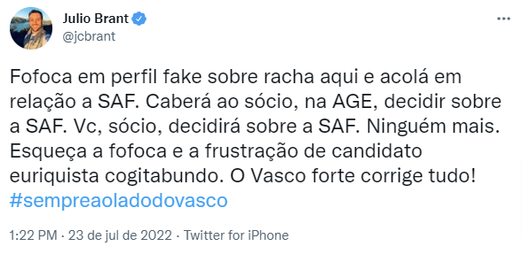 Fofoca em perfil fake sobre racha aqui e acolá em relação a SAF. Caberá ao sócio, na AGE, decidir sobre a SAF. Vc, sócio, decidirá sobre a SAF. Ninguém mais. Esqueça a fofoca e a frustração de candidato euriquista cogitabundo. O Vasco forte corrige tudo! #sempreaoladodovasco