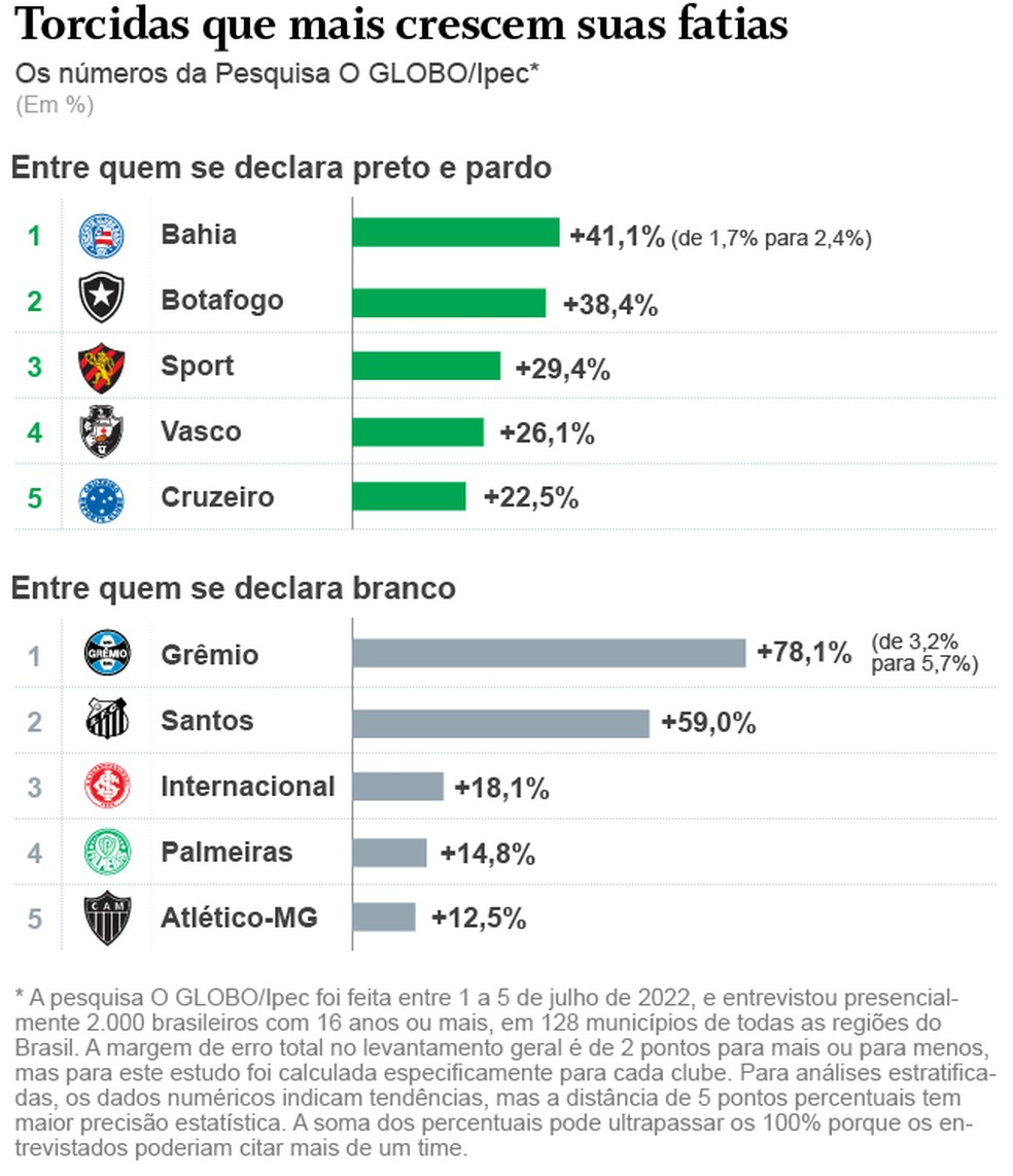 Para além do azul, vermelho e branco, o preto é cor fundamental no Bahia. Torcida que mais se destaca no recorte por raça ou cor da pele da pesquisa O GLOBO/Ipec, os tricolores veem sua fatia nacional crescer mais de 40% entre os negros. No geral, o Bahia foi a 12ª torcida mais citada, com 1,7%. Entre quem se declara preto ou pardo, a classificação sobe para 7º, com 2,4% (entre os brancos, fica apenas em 13º, com menos de 1,5%).