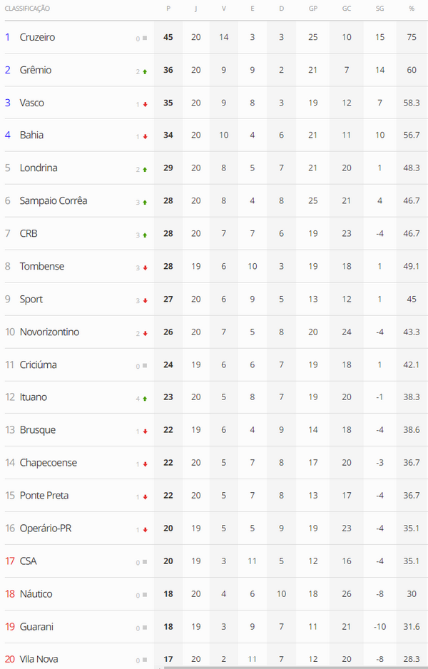 Veja a classificação da Série B após os jogos de sábado; Vasco cai para 3º e está a 6 pontos do 5º colocado