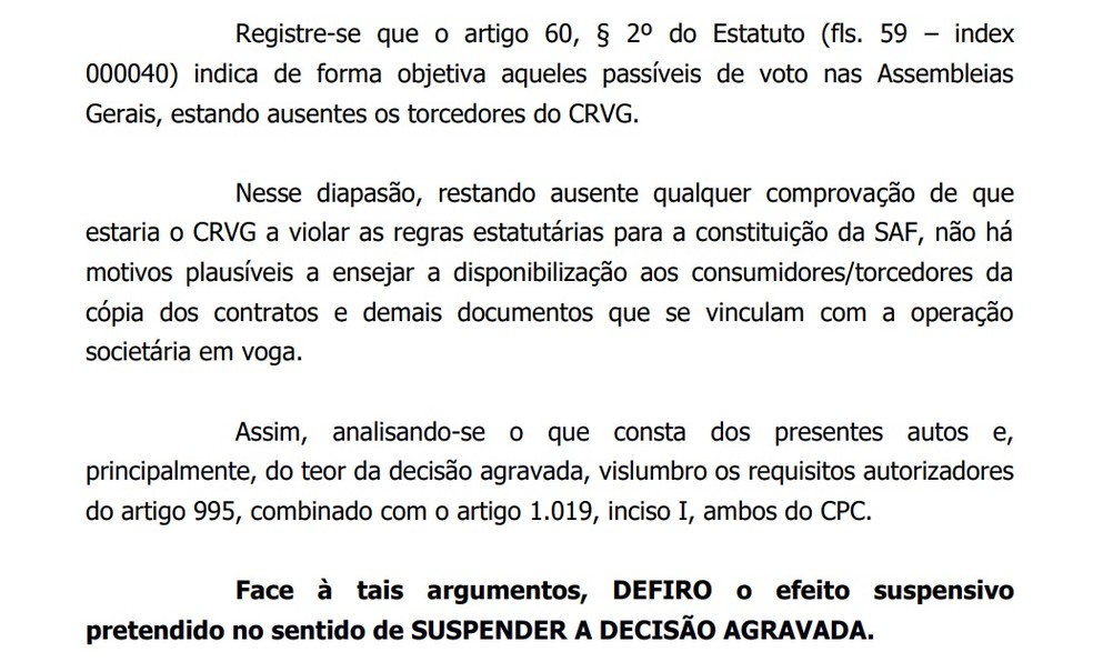 - Registre-se que, a medida pretendida com a Ação Coletiva, qual seja, a disponibilização aos consumidores/torcedores da cópia dos contratos e demais documentos que se vinculam com a operação societária de constituição da SAFCRVG e a alienação de 70% (setenta por cento) da participação societária à investidora 777 Partners, para a análise minuciosa da referida por todos os membros do conselho deliberativo e demais interessados, antes da votação de aprovação ou não da operação; mostra-se totalmente descabida para o fim a que se destina - diz trecho da decisão.