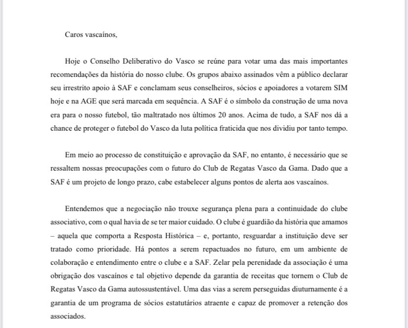 Hoje o Conselho Deliberativo do Vasco se reúne para votar uma das mais importantes recomendações da história do nosso clube. Os grupos abaixo assinados vêm a público declarar seu irrestrito apoio à SAF e conclamam seus conselheiros, sócios e apoiadores a votarem SIM hoje e na AGE que será marcada em sequência. A SAF é o símbolo da construção de uma nova era para o nosso futebol, tão maltratado nos últimos 20 anos. Acima de tudo, a SAF nos dá a chance de proteger o futebol do Vasco da luta política fraticida que nos dividiu por tanto tempo.