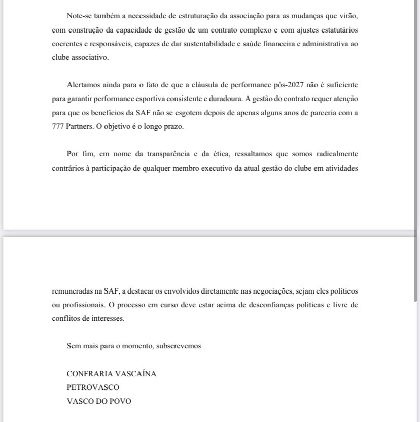 No último parágrafo, eles ressaltam que são "radicalmente contrários à participação de qualquer membro executivo da atual gestão do clube em atividades remuneradas na SAF, a destacar os envolvidos diretamente nas negociações, sejam eles políticos ou profissionais".