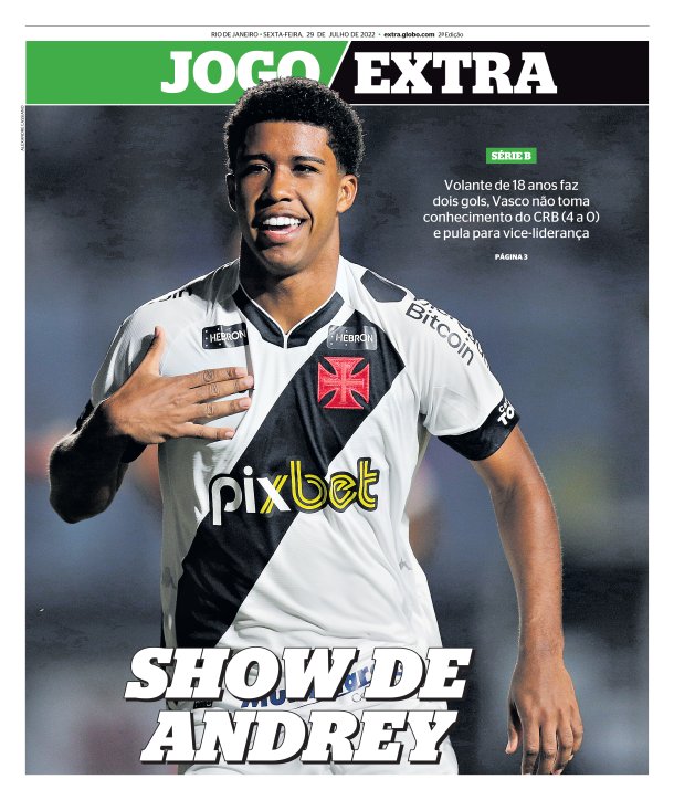 Pelo Brasileiro da Série B, o Vasco goleou o CRB por 4 a 0 em São Januário com gols de Andrey Santos (2), Raniel e Eguinaldo (seu primeiro como profissional). Veja as capas dos jornais.