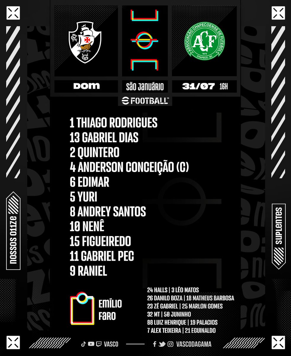 Confira a escalação do Vasco para o jogo contra a Chapecoense; Gabriel Dias é a novidade no time titular e Alex Teixeira é opção no banco