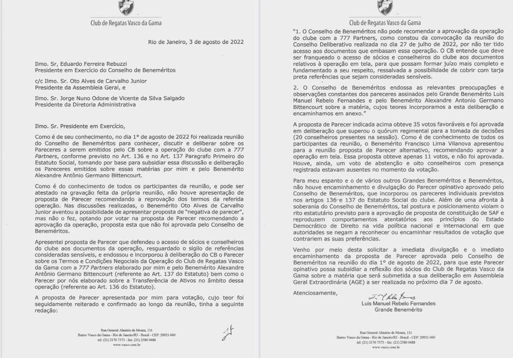 Um Benemérito do Vasco protocolou, nesta quarta-feira, um pedido na secretaria do clube para que fosse divulgado o parecer do Conselho de Beneméritos, aprovado em reunião na última segunda-feira. Eles alegam que não seria possível emitir um parecer favorável à venda da SAF para a 777 por não terem acesso aos contratos com o grupo americano. Também não houve reprovação.