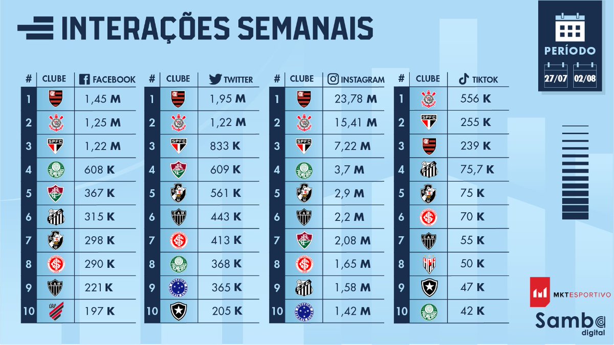 Vasco foi o 7º clube em interações no Facebook e o 5º no Instagram, no Twitter e no TikTok entre 27/07 e 02/08