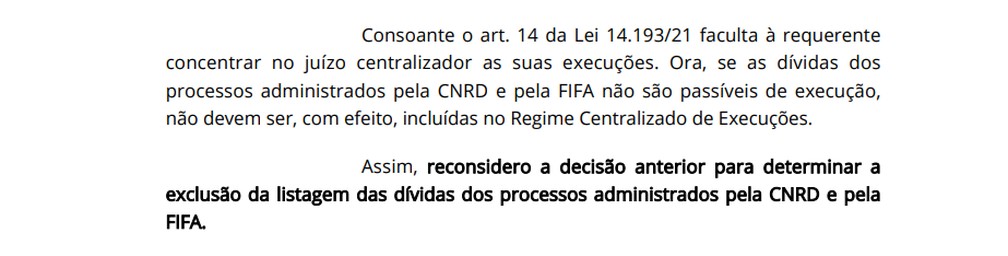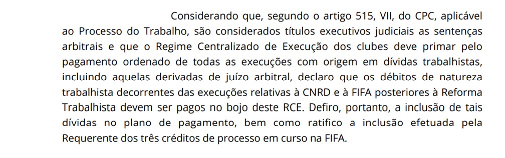 Dentro dos processos centralizadores que correm na Justiça do Trabalho e no Tribunal de Justiça, houve uma discussão nos últimos meses sobre como o clube, sufocado em dívidas e cobrado de todas as partes, deveria agir em relação ao assunto. Até que uma decisão publicada há pouco mais de um mês pela presidente do Tribunal Regional do Trabalho deu o norte: foram retirados da lista do RCE todos os credores com execuções na Fifa e na Câmara Nacional de Resolução de Disputas (CNRD), que é a corte arbitral da CBF.