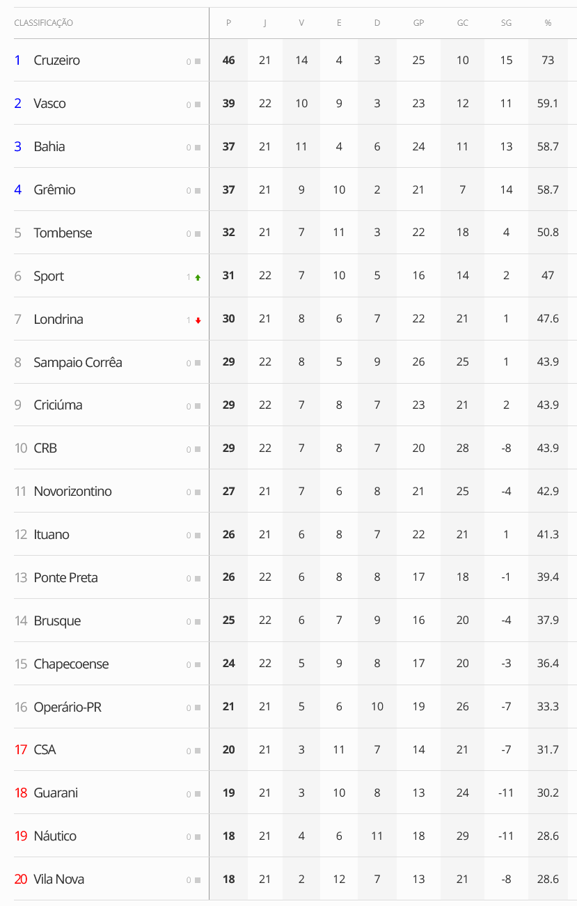 Veja a classificação da Série B após os jogos de 5ª-feira; Vasco está em 2º lugar