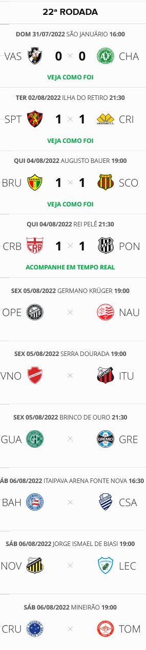 Dois jogos deram seguimento, nesta 5ª-feira, à 22ª rodada do Brasileiro da Série B. Os resultados não influíram na situação do Vasco, que segue em 2º lugar, a 7 pontos do líder e a 7 pontos do 5º colocado.